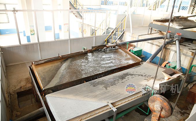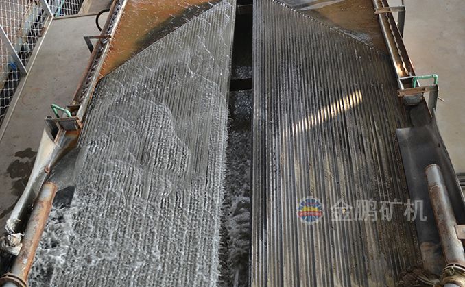 礦粒群從6s搖床床面上角的給礦槽送入,同時由給水槽供給橫向沖洗水,于是礦粒在重力,橫向流水沖力,床面作往復不對稱運動所產(chǎn)生的慣性和摩擦力的作用下,按比重和粒度分層,并沿床面作縱向運動和沿傾斜床面作橫向運動。比重和粒度不同的礦粒沿著各自的運動方向逐漸扇形流下,分別從搖床精礦端和尾礦側(cè)的不同區(qū)排出,最后被分成精礦,中礦和尾礦。